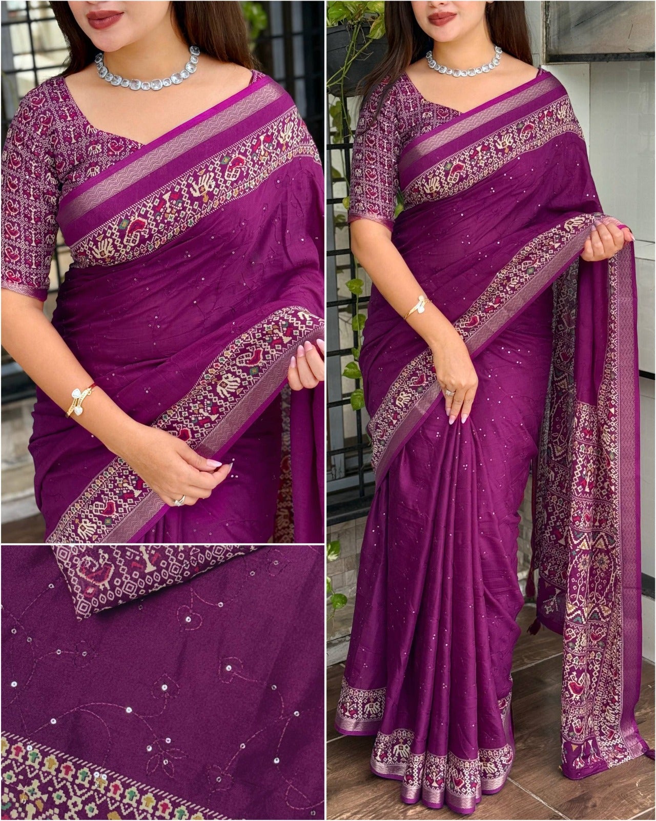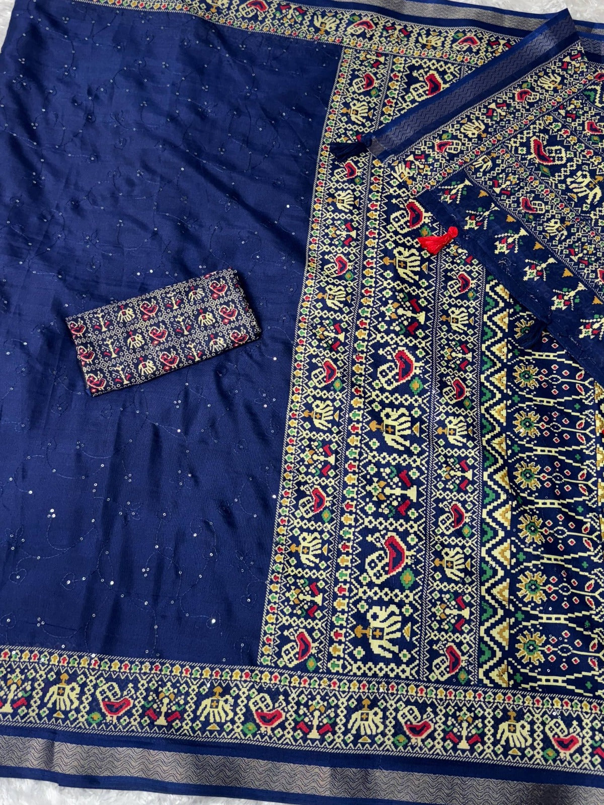 Design | Thread work with sequins in zaal pattern in full saree Ajrakh Printed saree with zari jacquard border Tussles in pallu |