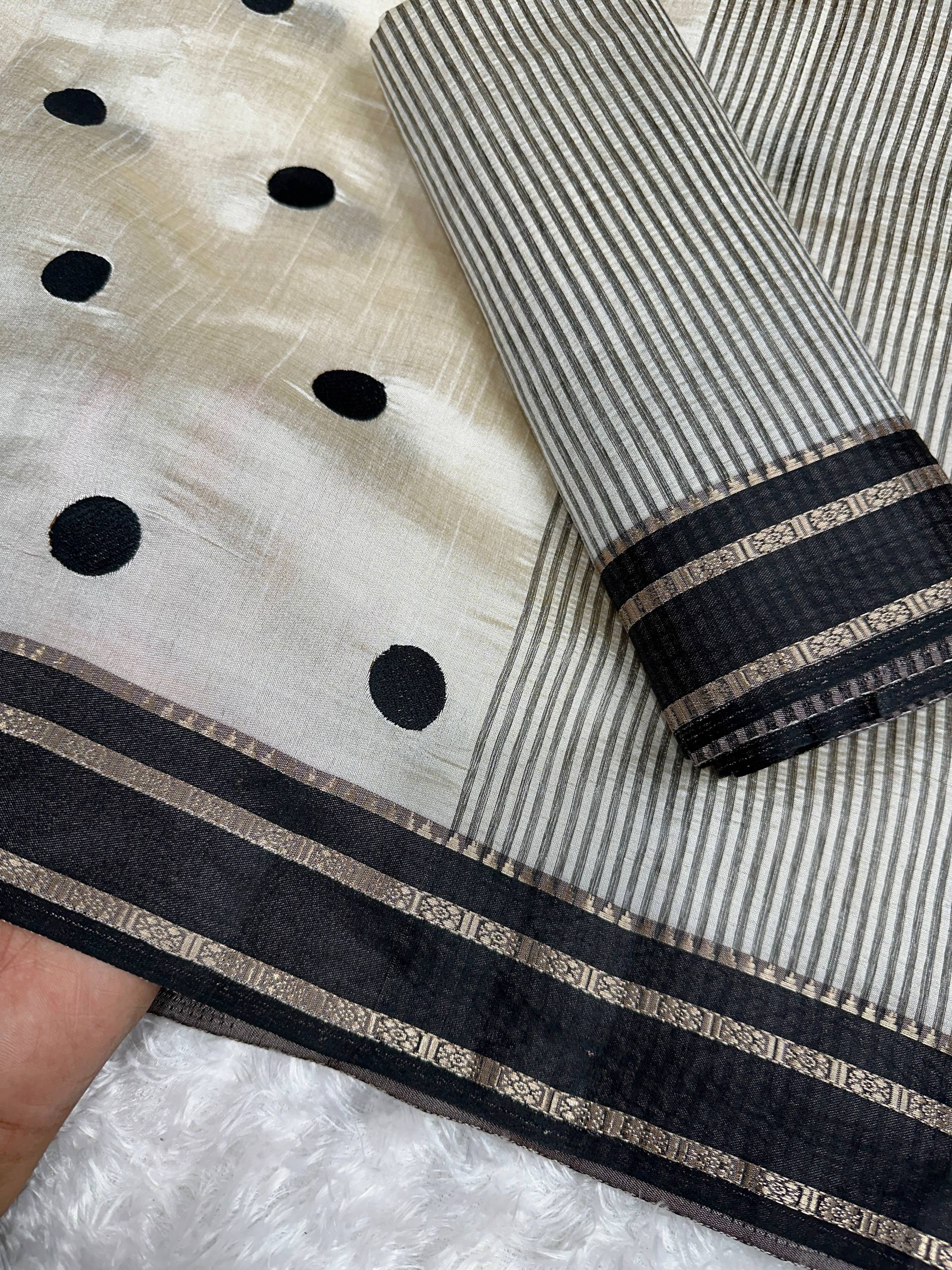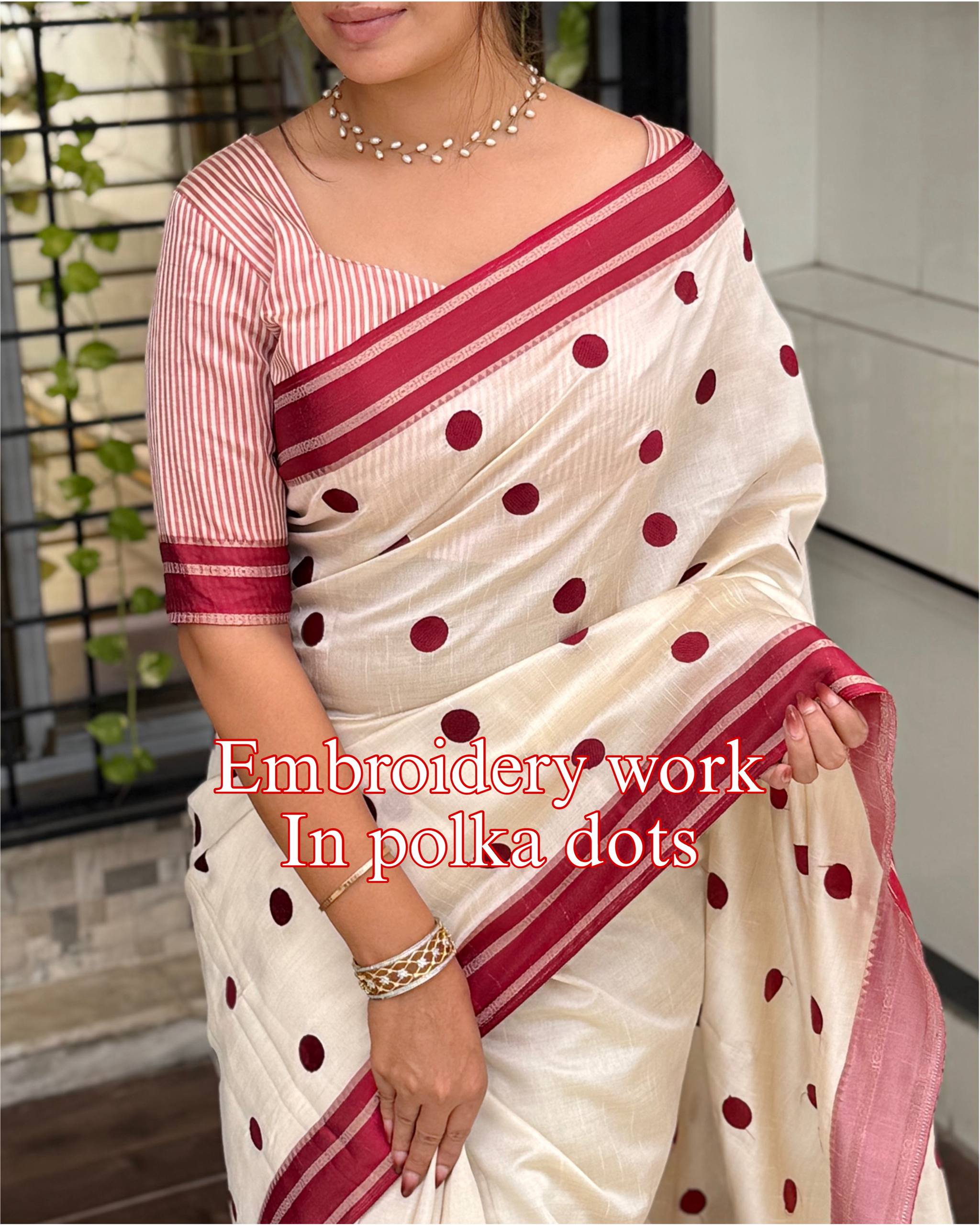 Design | 1-Thread Embroidered polka dots work in full saree 2- contrast stripes pattern in blouse 3-contrast border with zari weaving pattern in saree border |