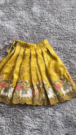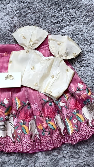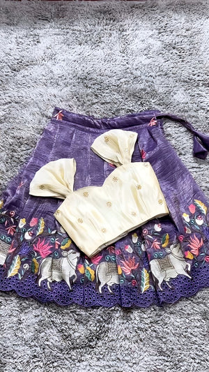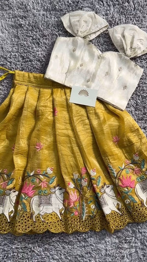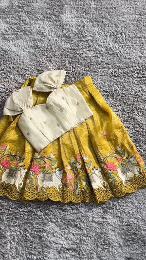Fuchsic Premium Cotton Cow Embroidered Cut Work Kids Lahenga With Top