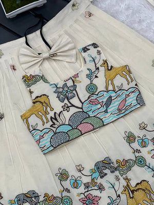 The Glamorous Pure Cotton Hiran Embroidered Kids Lahenga and Top is crafted with high-quality cotton and embellished with intricate embroidery.