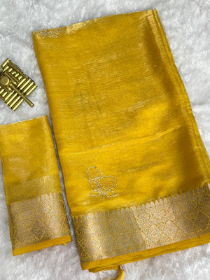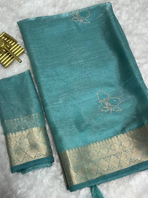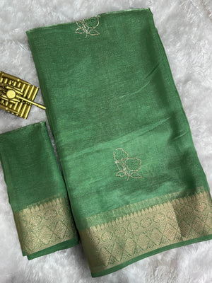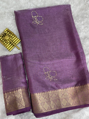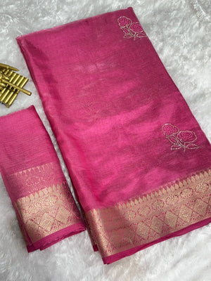 | Design | 1- Tome to tone Pearl & savroski butta work in full saree 2-zari weaving chitt pallu in saree with zari jacquard border 3- Tussles in pallu |