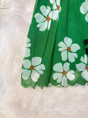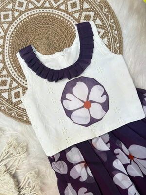 | Design | Circular Floral Printed Lahenga with Contrast Pleated Neck Blouse |