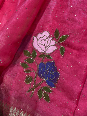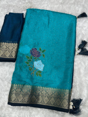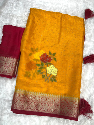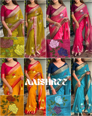 | Design | 1- zari jacqaurd weaving in full saree & blouse with chitt pallu 2- Brush print with heavy zarkhan diamond work outing in full saree 3-contrast color in blouse 4- Fancy tussles in saree pallu |