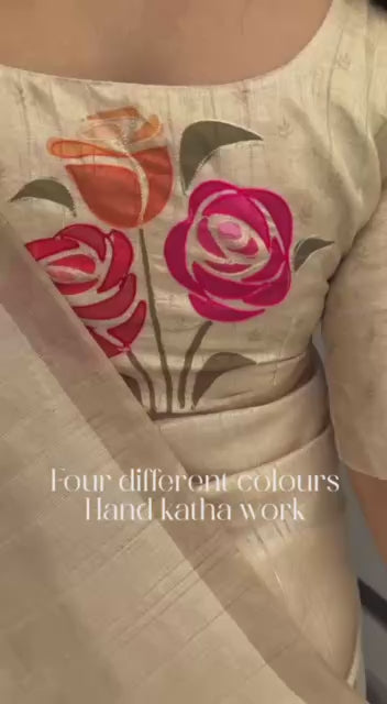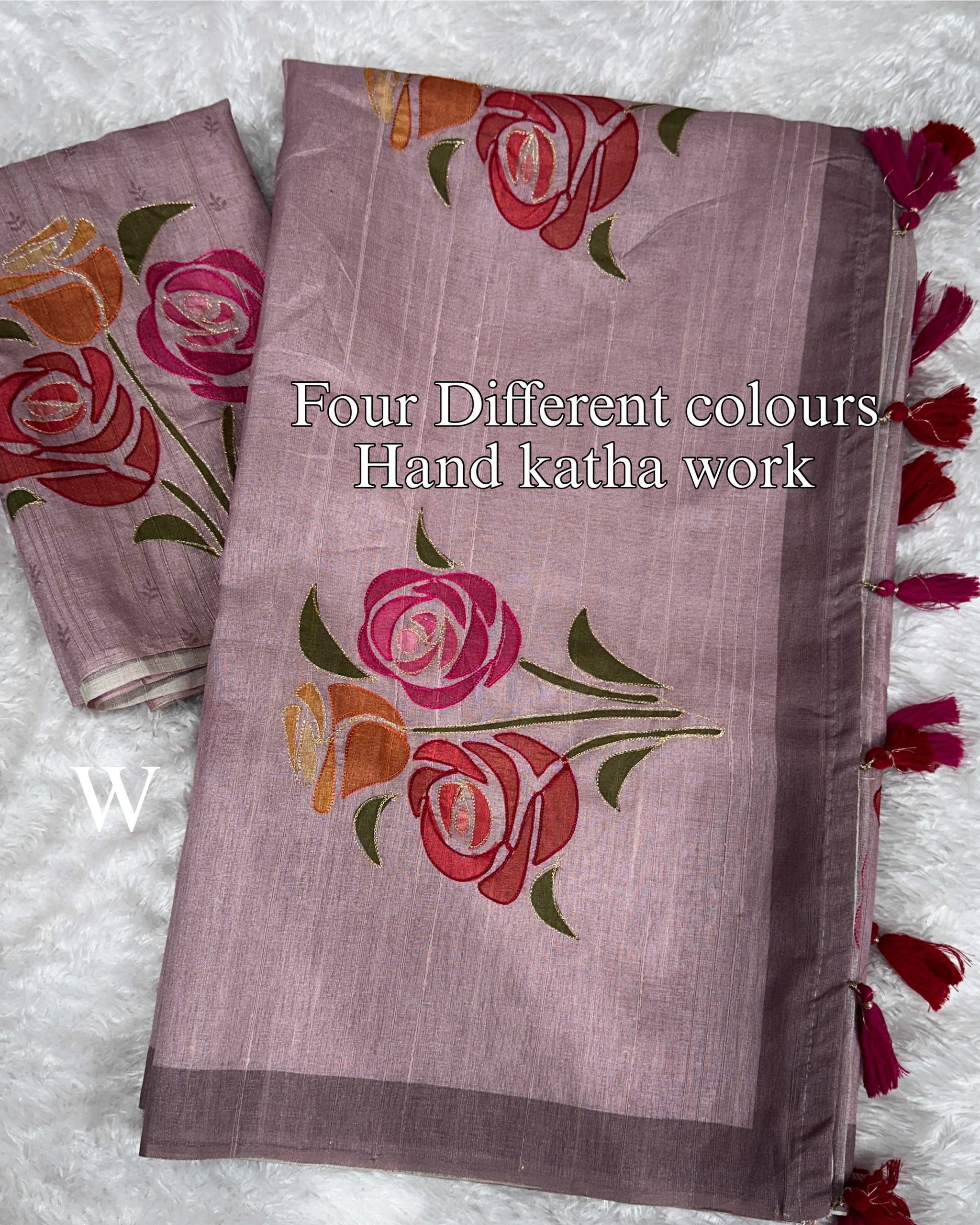Design | 1- Thread Hand position khatha work in saree 2-Multi color hand brush print effect in saree 3- Hand position khatha work in blouse 4-Fancy tussles in saree pallu |