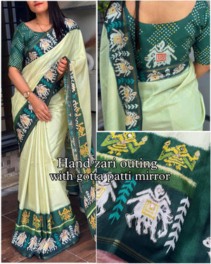 | Design | 1-Digital print in saree with zari border 2- hand zari khata work with gotta patti mirror 3-Digital print in blouse |